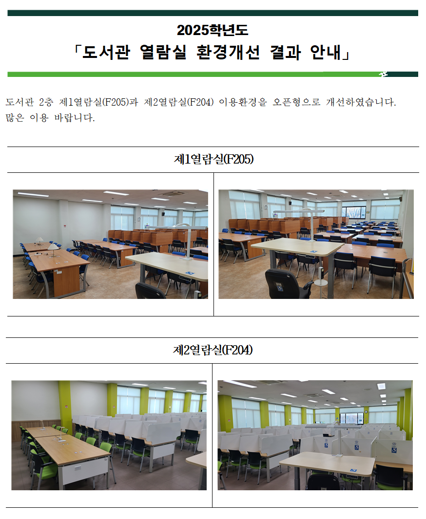 일반공지 학생공지 일반공지 장학/학자금 공지 감염병안내 공모/모집/시험 도서관 생활관 기부금공개 업무추진비공개 보육교원연수원 기타공고 충청대학교_대표-학생공지(대표_충청마당_공지사항_학생공지) 상세보기 - 제목, 내용, 파일, 작성자, 조회수, 작성일, 학과공지, 주소링크 정보 제공 【도서관】 열람실 환경개선 안내 작성자 : 강희진 작성일 : 2025-11-26 조회 : 330 열람실 환경개선 안내 파일 png 문서 2025 도서관 열람실 환경개선 안내_20251125.png 주소링크 https://clis.ok.ac.kr/#/bbs/notice/1400 목록 게시물삭제 광고 반복작성 욕설 본인삭제 게시물삭제 다음글 【도서관】 2025년 전자자널 DBpia 온라인 실시간 이용 교육 안내(6차)